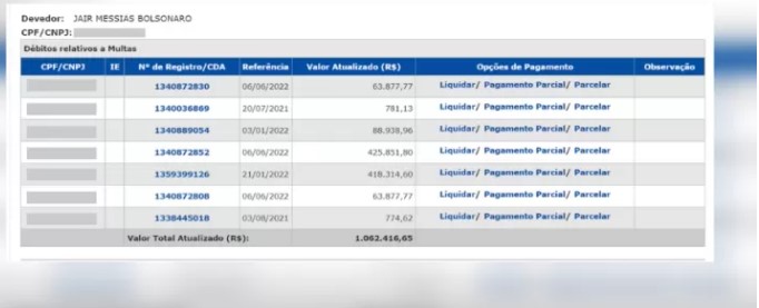 As dívidas do ex-presidente Jair Bolsonaro (PL) com o estado de São Paulo ultrapassam R$ 1 milhão, segundo os registros no site da Dívida Ativa do governo do estado. O que aconteceu: Ao todo são sete multas em nome do ex-presidente, no total de R$ 1.062.416,65 (valor atualizado com correções monetárias), de acordo com o site da Dívida Ativa do estado.