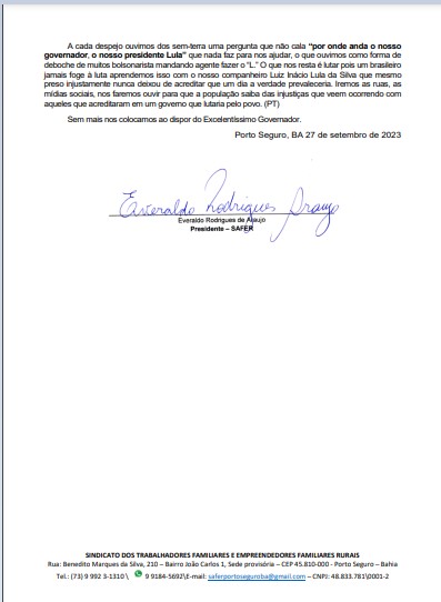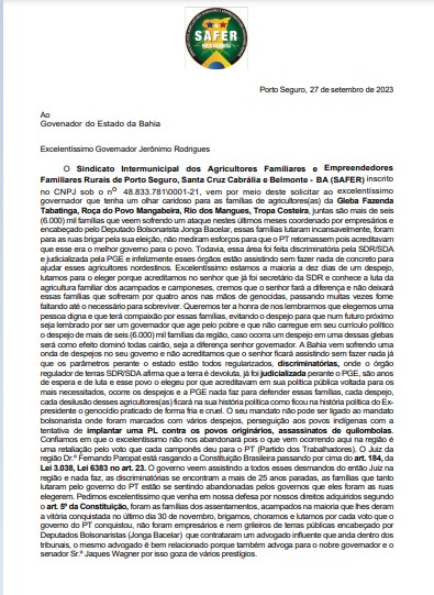 Acredita-se que o governador não deseje manchar sua biografia, construída em defesa dos trabalhadores. Afinal, “um brasileiro jamais foge à luta”, como bem diz o documento divulgado pelo líder da SAFER (Sindicato Intermunicipal do Agricultores Familiares e Empreendedores Familiares Rurais de Porto Seguro, Santa Cruz Cabrália e Belmonte-BA), Everaldo Araújo.
