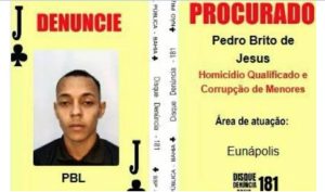 Pedro Brito de Jesus, conhecido como “PBL”, passou a integrar o Baralho do Crime da Secretaria da Segurança Pública da Bahia (SSP-BA), ferramenta que reúne os criminosos mais procurados do estado. Ele foi incluído como o novo Valete de Paus nesta, por envolvimento direto com o tráfico de drogas e homicídios no município de Eunápolis, no Extremo Sul da Bahia.