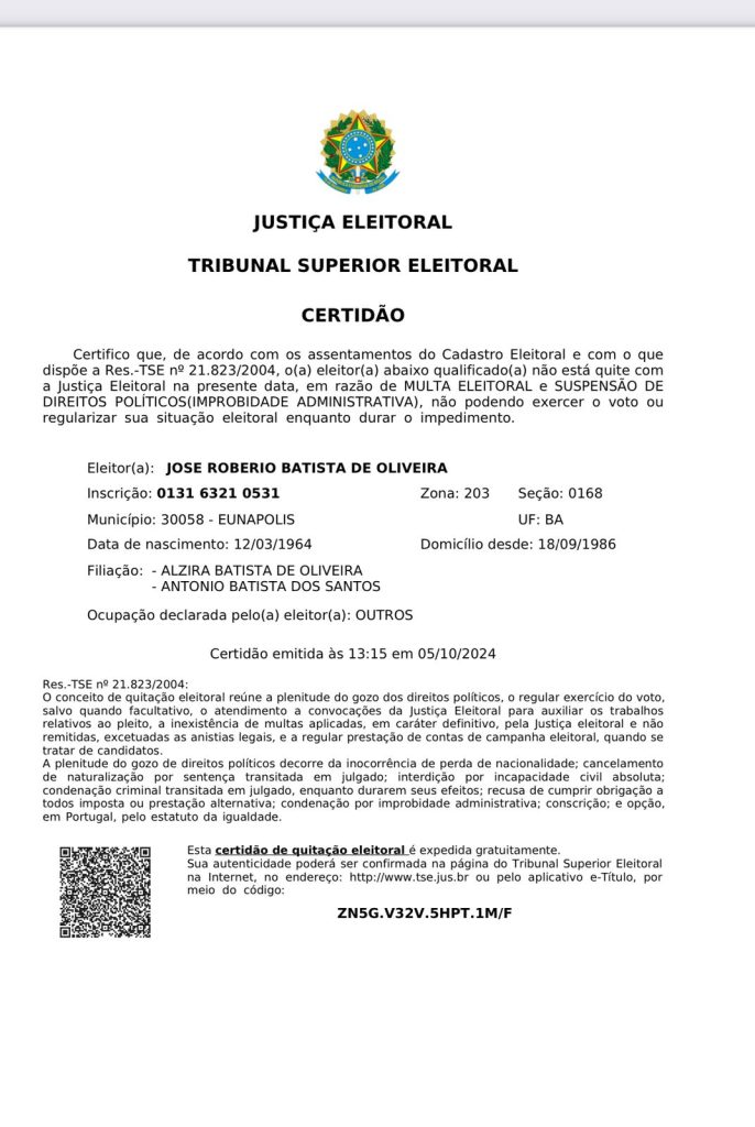 De acordo com a Justiça Eleitoral, ele está impedido de participar do pleito devido a uma multa eleitoral não paga e à suspensão de seus direitos políticos, consequência de uma condenação por improbidade administrativa.