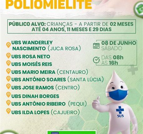 A Prefeitura de Eunápolis, por meio da Secretaria Municipal de Saúde, realiza neste sábado, dia 08/06, o Dia D da vacinação contra a poliomielite nas Unidades Básicas de Saúde (UBS) do município. As unidades estarão abertas das 8h às 16h para receber as crianças menores de 5 anos, e garantir a imunização contra essa grave doença.