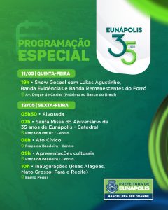 Na sexta-feira (12/05), aniversário de Eunápolis, a programação terá início com uma grande alvorada festiva às 05h30. Às 7h, acontece a Santa Missa do aniversário de 35 anos de Eunápolis na Catedral Nossa Senhora Auxiliadora. Às 08h, na Praça da Bandeira, será realizado o ato cívico de hasteamento das bandeiras e, logo após, os festejos continuam, no mesmo local, com apresentações das oficinas artísticas e culturais do município.