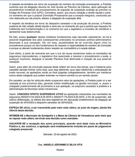 A Justiça da Bahia suspendeu, nesta quarta-feira (23/08), a sessão da Câmara de Vereadores de Eunápolis que iria votar o parecer favorável da Comissão Processante pela cassação da prefeita Cordélia Torres. A decisão foi tomada pelo desembargador Ângelo Jerônimo e Silva Vita, que acatou um recurso da defesa da gestora municipal. Segundo o magistrado, houve irregularidades na constituição da comissão, que não respeitou os princípios do contraditório e da ampla defesa, já relatados em decisões anteriores.