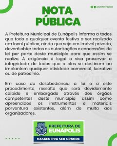 A Prefeitura do município de Eunápolis (BA) divulgou nesta sexta-feira, (26/05), nota pública em que alerta aos empreendedores e moradores no geral, de que quaisquer eventos festivos (público ou privado) realizados em espaço público terão que ter autorização e concessão prévia da autoridade municipal pertinente.