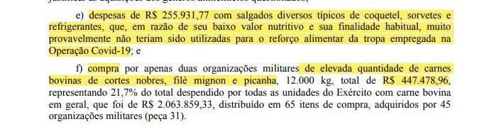 Os auditores descobriram que o Exército gastou R$ 255,9 mil em “salgados diversos típicos de coquetel, sorvetes e refrigerantes, que, em razão de seu baixo valor nutritivo e sua finalidade habitual, muito provavelmente não teriam sido utilizados para o reforço alimentar da tropa empregada na Operação Covid-19”.