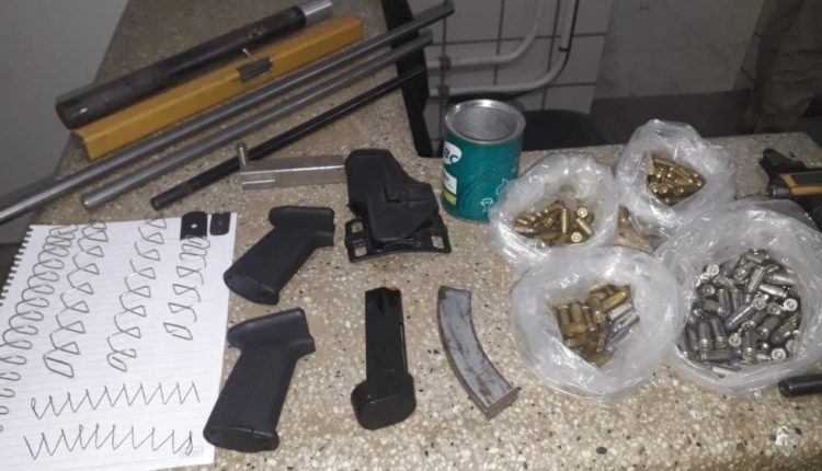 Com ele foram encontradas duas submetralhadoras, uma finalizada e outra em processo de fabricação, 307 cartuchos para os calibres 40, 22 e 9 milímetros, R$ 8,9 mil, canos, molas, carregadores e punhos.