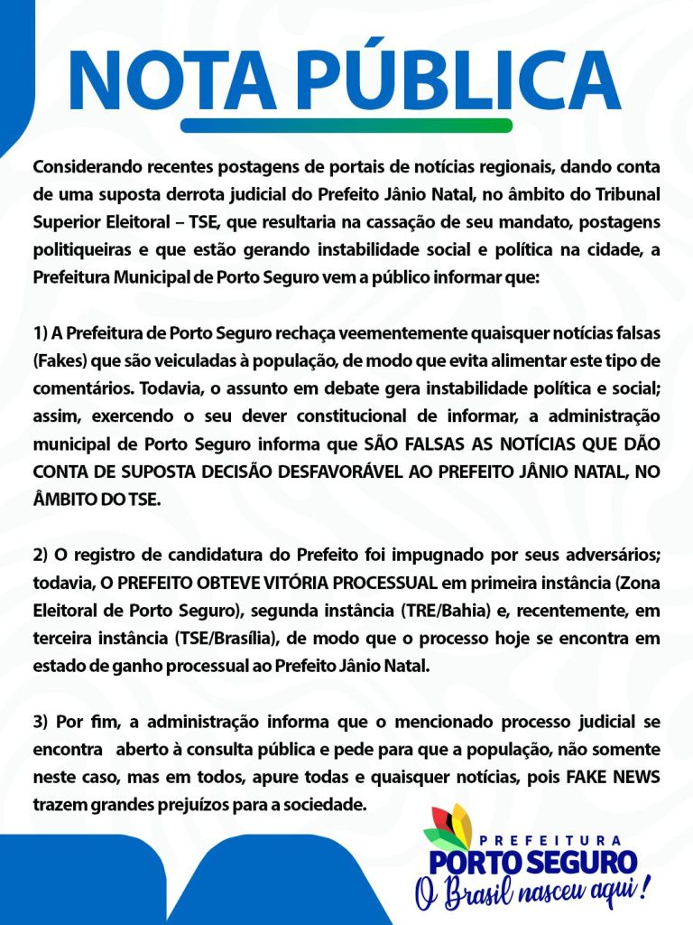 A Prefeitura de Porto Seguro divulgou, nesta quarta-feira (13/08), uma nota oficial rebatendo boatos espalhados nas redes sociais por opositores políticos. Segundo o comunicado, as chamadas fake news são fruto de uma “oposição ressentida”, derrotada de forma contundente nas últimas eleições municipais, e têm o objetivo de criar falsa narrativa de que o mandato do prefeito Jânio Natal estaria prestes a ser interrompido.