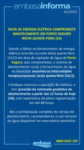 Devido a falhas no fornecimento de energia elétrica ocorrida na noite de quarta-feira (15/2) em área da captação de água de Porto Seguro, que comprometeu o sistema de abastecimento local, o fornecimento de água no município encontra-se interrompido temporariamente nesta quinta-feira (16/2).