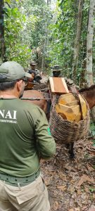 Durante a operação, as equipes se depararam com um homem transportando, em um burro, peças de madeira manufaturadas em formato de gamela, prontas para comercialização. Ao perceber a aproximação dos agentes de fiscalização, o suspeito abandonou o animal e fugiu para dentro da mata fechada, impossibilitando sua captura no momento. Após a análise da carga, constatou-se que a madeira apreendida era de Sucupira, uma espécie nativa ameaçada, cuja exploração e comercialização estão proibidas sem autorização legal. O material, juntamente com o animal, foi apreendido e está à disposição das autoridades para as providências legais cabíveis.
