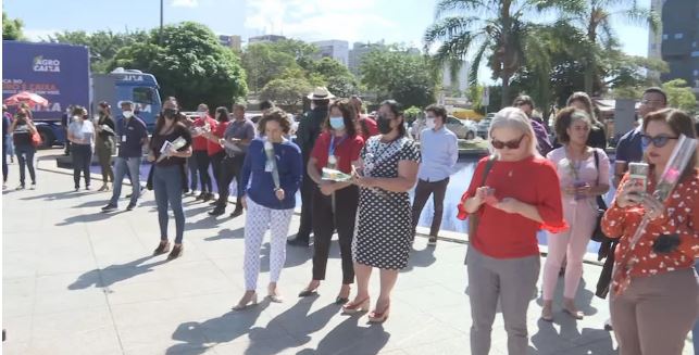 A manifestação, organizada pelo sindicato dos trabalhadores, pede a “saída urgente” de Pedro Guimarães do cargo. Os participantes fazem discursos contra o gestor e entregam flores a funcionárias que entrar ou saem do prédio.