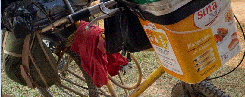 O homem também trouxe consigo diversos colares para vender durante suas viagens de bicicleta.