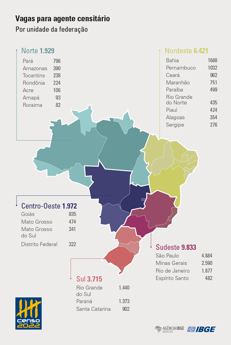 O IBGE abriu nesta quarta-feira (15/12) as inscrições do processo seletivo para contratar 183.021recenseadores que vão trabalhar na coleta de informações do Censo Demográfico 2022. São vagas de nível fundamental distribuídas em 5.297 municípios do país. Durante as inscrições, que vão até 29 de dezembro de 2021, o candidato deverá escolher a área de trabalho e em qual cidade realizará a prova. A taxa para participar da seleção é de R$ 57,50, pode ser paga até 25 de janeiro, e a prova será aplicada na manhã do dia 27 de março de 2022. A previsão é que os aprovados trabalhem por até três meses na coleta domiciliar.
