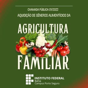 O IFBA campus Porto Seguro torna público o Edital nº 01/2022 de Chamada Pública para Aquisição de Gêneros Alimentícios da Agricultura Familiar e do Empreendedor Familiar Rural, destinado ao atendimento ao Programa Nacional de Alimentação Escolar – PNAE.