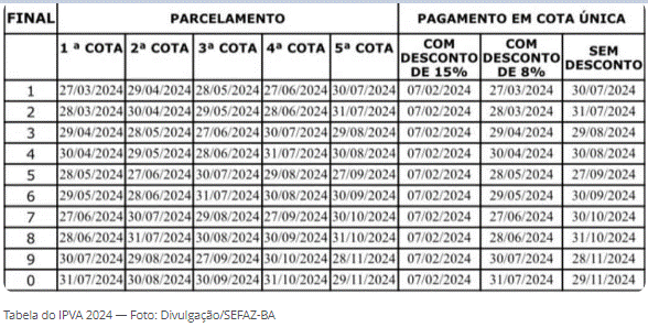 - O Governo da Bahia manteve também a possibilidade de parcelamento em cinco vezes, que pode ser feito conforme o calendário anual, levando em conta o número final da placa do veículo;