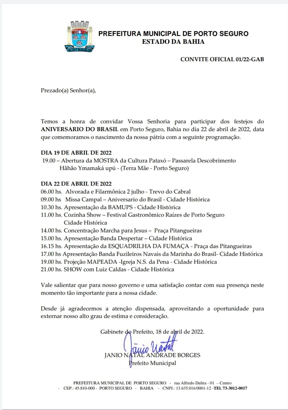 O prefeito de Porto Seguro, Jânio Natal convoca a população em geral para a comemoração dos 522 anos do Brasil.