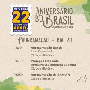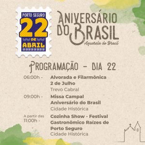 Durante o dia 22 de abril haverá uma longa programação, que se inicia com uma alvorada às 6:00 horas, com a Filarmônica 2 de Junho, no Trevo do Cabral, e segue o dia inteiro com um cardápio variado para todos os gostos; com destaque para a apresentação da “Esquadrilha da Fumaça”, cuja exibição nos céus de Porto Seguro, poderá ser melhor acompanhada na Praça das Pitangueiras, Orla Norte da cidade, a partir das 16:00 hs.