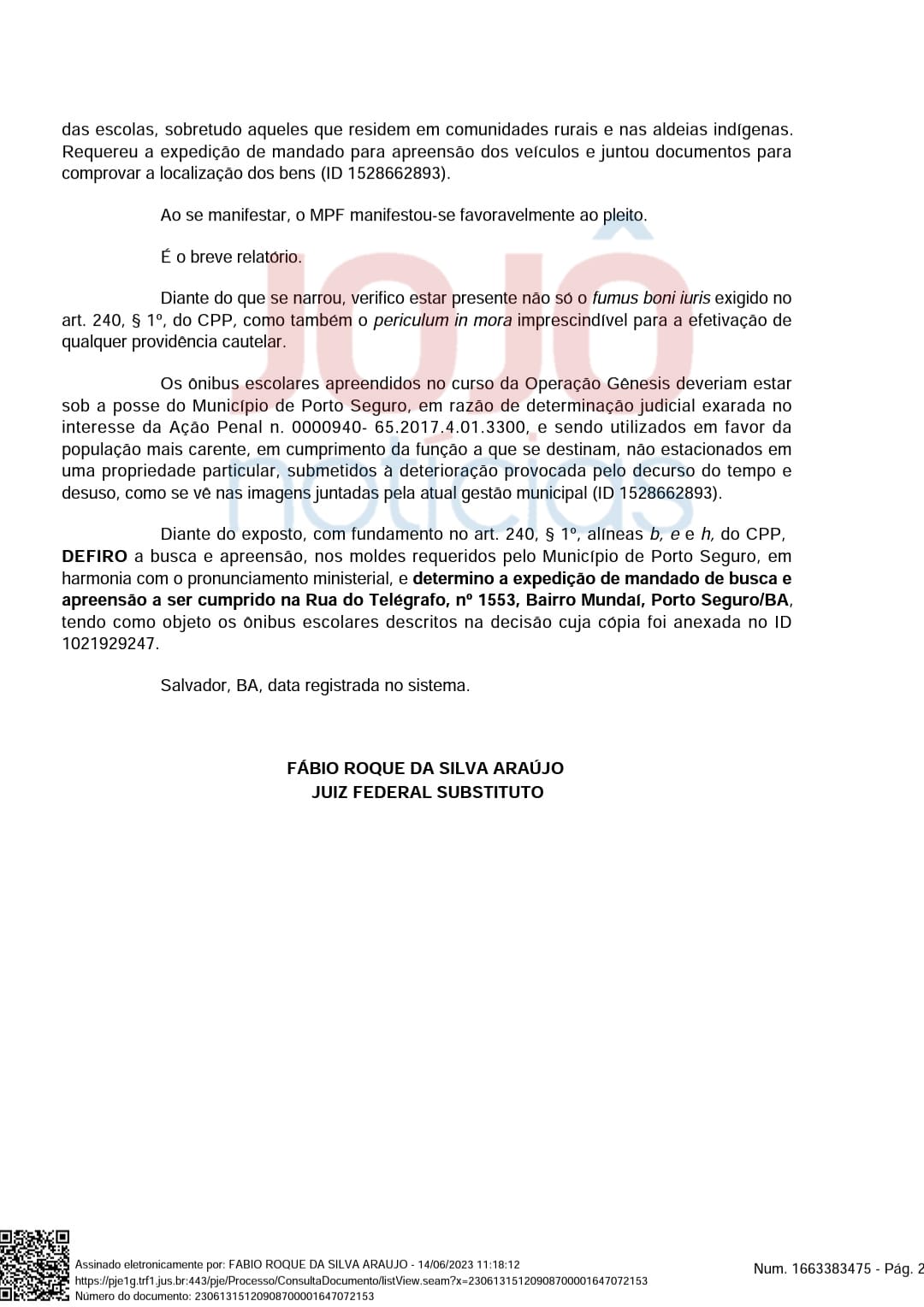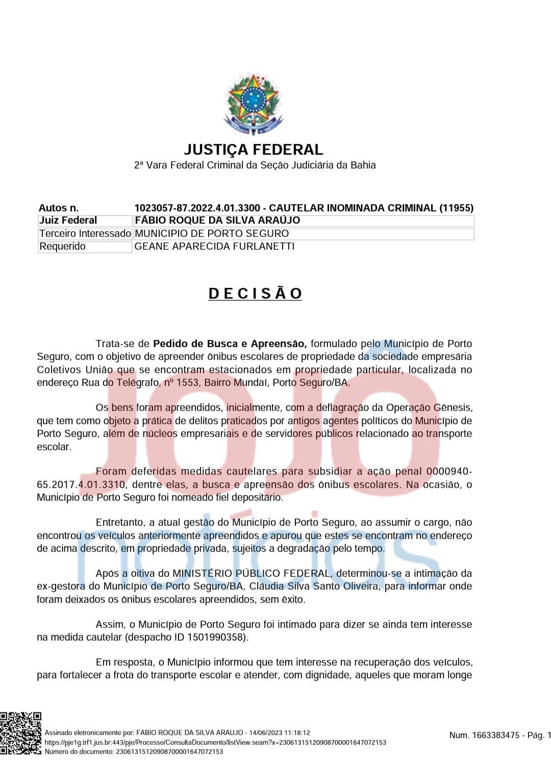 Após oitiva do Ministério Público Federal, e constatada a situação acima relatada; os ônibus escolares apreendidos no âmbito daquela operação, em que o município demonstrou interesse para que fossem recuperados e integrados à frota do transporte escolar, com o objetivo de atender, com dignidade, aqueles que moram longe das escolas, sobretudo aqueles que residem em comunidades rurais e nas aldeias indígenas; foi determinada a intimação da ex-gestora do Município de Porto Seguro/BA, Cláudia Silva Santos Oliveira, para informar onde foram deixados os ônibus escolares apreendidos, sem êxito.