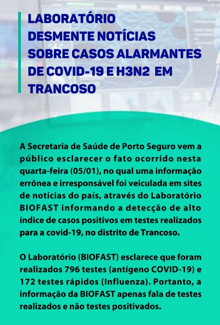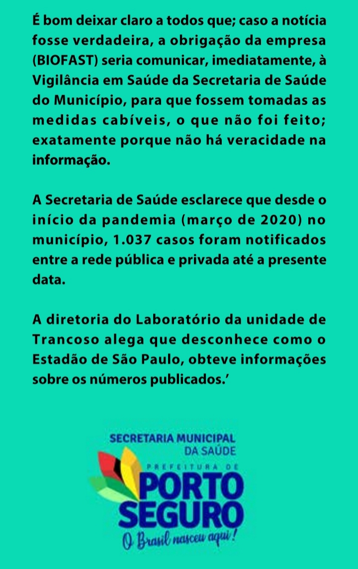 Notícia sordidamente falsa, criada e compartilhada por opositores inconformados e inimigos de Porto Seguro, foi categoricamente rechaçada pela diretoria da unidade do Laboratório BIOFAST em Trancoso.