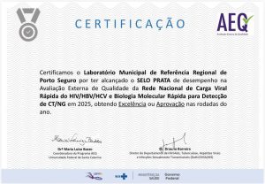 O Laboratório Municipal de Referência Regional de Porto Seguro foi agraciado com o Selo Prata na Avaliação Externa de Qualidade (AEQ) da Rede Nacional de Carga Viral Rápida do HIV/HBV/HCV e Biologia Molecular Rápida para Detecção de CT/NG, certificação vinculada ao Ministério da Saúde.