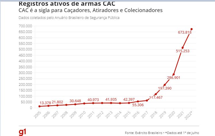 Em 2018, antes de Bolsonaro assumir, o número de pessoas com registros CAC era de 117,5 mil. Ou seja, 56 brasileiros a cada 100 mil possuíam licença para armas. Agora há 673,8 mil registros. Isso quer dizer que, a cada cem mil pessoas, 314 têm a autorização.