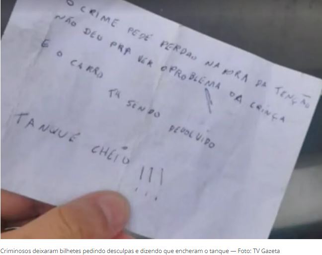 A família já recuperou o carro. Mas, ao contrário do que diz o bilhete, o tanque não estava cheio. “Quando levaram, ele estava com um quarto de tanque. Encontramos na reserva. Não deixaram, pelo contrário, gastaram”, riu a mãe das crianças.