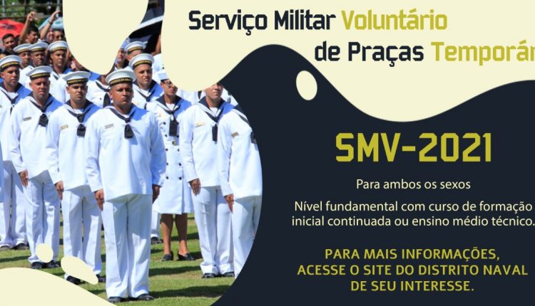 Estão abertas, até o dia 04/03/21, as inscrições no processo seletivo de admissão ao Serviço Militar Voluntário de Praças da Marinha, na área de jurisdição do Comando do Segundo Distrito Naval, para 2021.