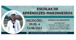 Estarão abertas, entre os dias 24/05/21 e 13/06/21, as inscrições para o Concurso Público de Admissão às Escolas de Aprendizes-Marinheiros (CPAEAM/2021).
