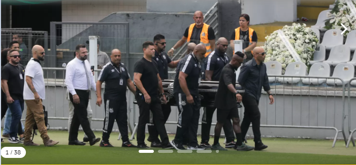 Após o término do velório, que foi realizado na Vila Belmiro, casa do Santos, e durou 24 horas, das 10h de ontem às 10h de hoje- Cerca de 230 mil pessoas passaram pelo velório- o cortejo, num carro do Corpo de Bombeiros, cumpriu um percurso de cerca de 15 quilômetros: saiu da Vila Belmiro, pegou a orla de Santos, passou pela casa de Dona Celeste, mãe do Rei, e voltou para o cemitério.