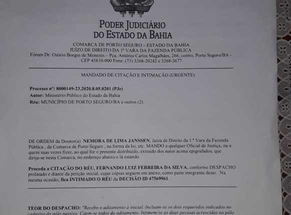 A ação civil pública tem como réus o município de Porto Seguro e Fernando Luiz Ferreira da Silva, e foi instalada pelo MP-BA, no início de janeiro deste ano.