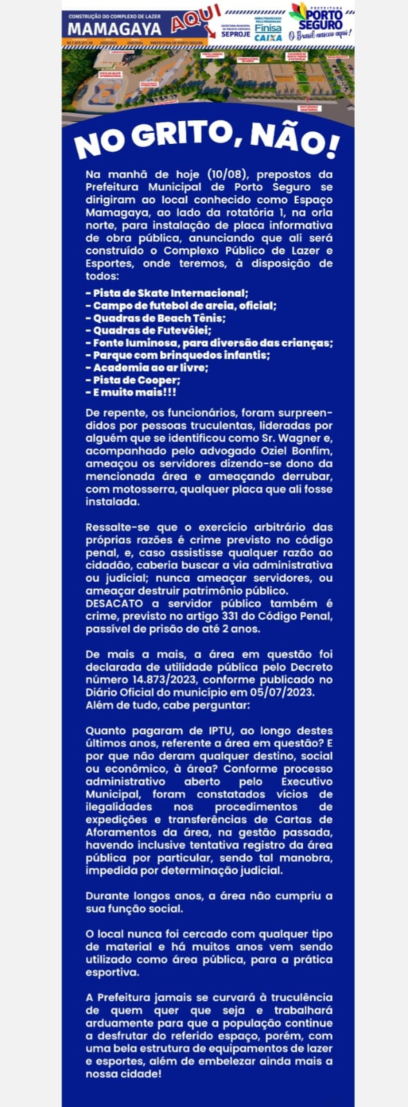 Na manhã de hoje (10/08), prepostos da Prefeitura Municipal de Porto Seguro se dirigiram ao local conhecido como Espaço Mamagaya, ao lado da rotatória 1, na orla norte, para instalação de placa informativa de obra pública, anunciando que ali será construído o Complexo Público de Lazer e Esportes, onde teremos, à disposição de todos: quadras poliesportivas, pista de skate, parque infantil, academia ao ar livre, ciclovia e área verde. O projeto faz parte do programação da administração municipal em tornar Porto Seguro Mais Bonita e Sustentável, que visa revitalizar espaços públicos e promover a qualidade de vida da população.