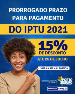 Os contribuintes de Porto Seguro ganharam mais dois meses de prazo para o pagamento do IPTU (Imposto Predial e Territorial Urbano) com desconto de 15% à vista. De acordo com o Decreto Municipal 12.253, de 25 de maio de 2021, a nova data é 26/7.