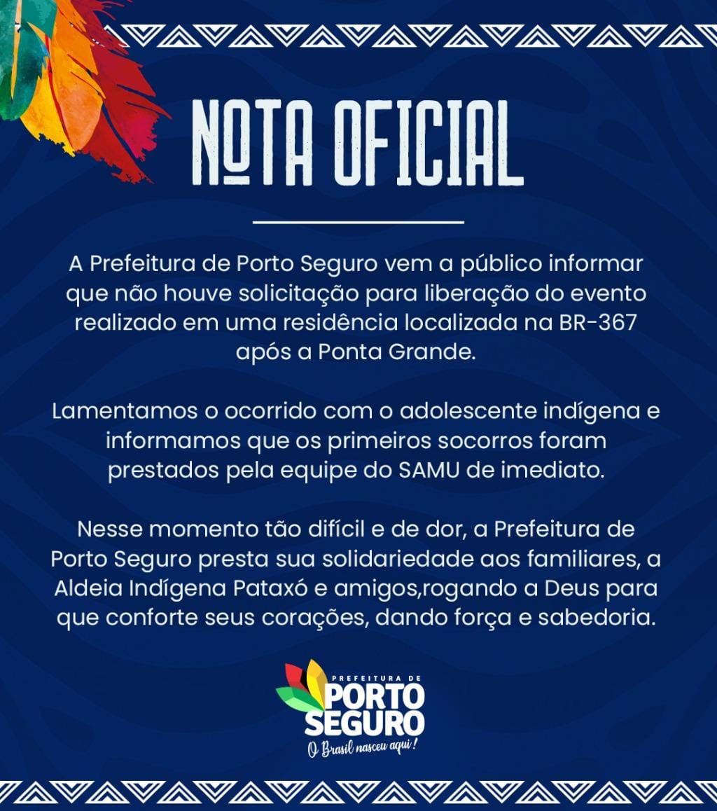 Contrariando informações veiculadas em algumas redes sociais de que o evento realizado na “Ponta Grande”, em Porto Seguro, que culminou com a morte de um jovem indígena, teria obtido licenciamento da administração municipal para sua realização, a Prefeitura Municipal de Porto Seguro divulgou nota negando a informação e repudiando, veementemente, a tentativa e oportunismo daqueles que vêem na tragédia a possibilidade de faturar politicamente com insinuações levianas e sórdidas.
