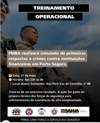 A Polícia Militar da Bahia (PMBA) realizará, na noite do próximo dia 21 de maio, um treinamento operacional que simula uma resposta a crimes contra instituições financeiras. A ação será conduzida das 22h às 0h, tendo como cenário a agência do Banco Santander, localizada na Rua Pero Vaz de Caminha, nº 88, no centro de Porto Seguro.