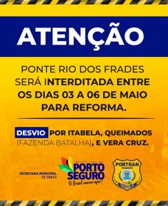 A ponte do Rio dos Frades que liga o município de Porto Seguro à distritos da Orla sul de Porto Seguro será interditada no período de 3 a 6 de maio para reformas.