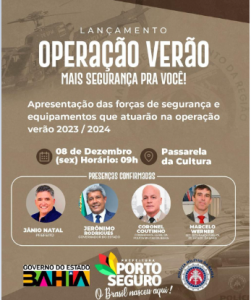 Nesta sexta-feira, (08/12), a Operação Verão 2023/2024 será lançada em Porto Seguro, na Passarela da Cultura, às 9h, contando com a presença do Governador da Bahia, Jerônimo Rodrigues; Prefeito de Porto Seguro, Jânio Natal; o Comandante-geral da Polícia Militar, Coronel Coutinho; e o Secretário de Segurança Pública, Marcelo Werner.