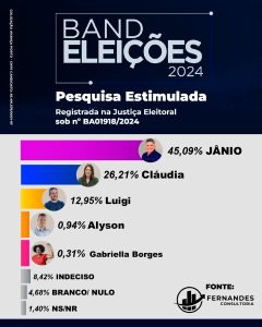 Pesquisa encomendada pela Rádio e TV Band, divulgada na tarde desta quarta-feira (2/10) confirmou a liderança do Prefeito e candidato à reeleição, Jânio Natal em Porto Seguro, com 42,9% nas intenções de voto e Cláudia Oliveira em segundo, com 26,21%.