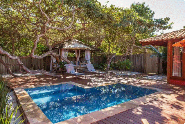 O Bangalô Master tem piscina privativa, pergolado, jacuzzi e área externa com redes. 👇