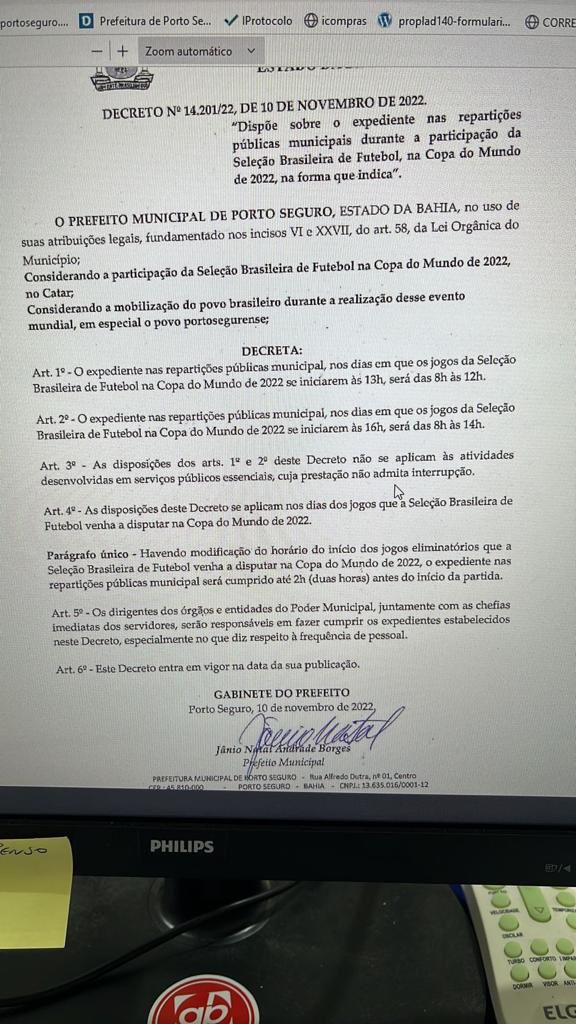 Em matéria postada ontem (10/11) no Jojô Notícias, (relembre aqui) questionávamos como os empresários, administrações e autarquias em todo o país, procederiam com os funcionários e servidores, em dias de jogos da Seleção Brasileira pela Copa do Mundo. Aqui, em Porto Seguro, o Prefeito Jânio Natal publicou, na data de ontem mesmo, (10/11) decreto Nº 14.201/22, que regulamenta a presença dos servidores nos diversos órgãos do município.