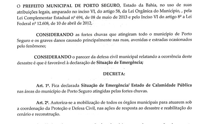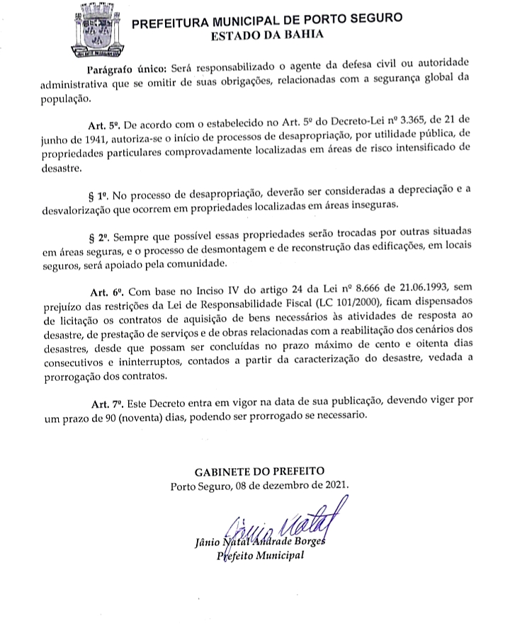 A prefeitura municipal de Porto Seguro editou nesta quarta-feira, (08/12), decreto nº 13.428/21 declarando Situação de Emergência devido às fortes chuvas que assolaram a cidade e deixaram vários bairros e localidades em estado de calamidade.