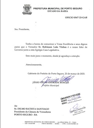 O ofício Nº 0567/23-GAB foi encaminhado nesta segunda-feira, (20/03) ao presidente da Câmara, Dilmo Santiago que deverá fazer a apresentação do novo líder, já na próxima sessão a se realizar na quinta-feira, (23/03).