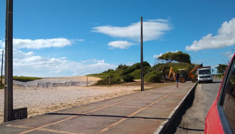 Retroescavadeira e caçambas a serviço da prefeitura foram flagradas nesta sexta-feira, 22/02, removendo areia numa área de restinga da praia, no município para, segundo moradores, confeccionar uma quadra para prática de futebol de areia.