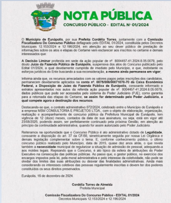Na nota divulgada pela administração municipal, a prefeita justificou sua decisão alegando que, diante do quadro judicial, a continuidade do concurso não seria viável. Com a transição de governo, ficou claro que a nova gestão será incumbida de analisar as questões legais e administrativas envolvidas no concurso, podendo até decidir pela reabertura do processo em um novo momento.