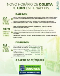 Com o intuito de melhorar o atendimento e a prestação do serviço de limpeza pública urbana, a Prefeitura de Eunápolis, por meio da Secretaria Municipal de Serviços Públicos, informa que o sistema de coleta de lixo seguirá novas rotas e horários a partir do dia 02 de janeiro de 2023.