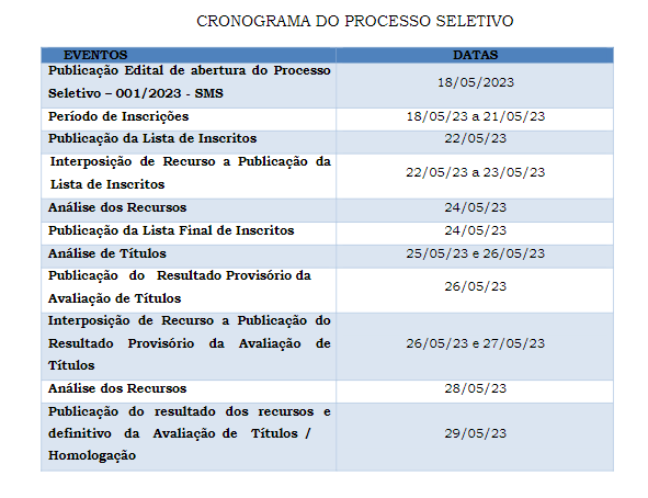 Para participar, os interessados devem efetuar as inscrições nos dias 18 e 19 de maio de 2023, até às 23h59, exclusivamente via internet por meio do site da Prefeitura.