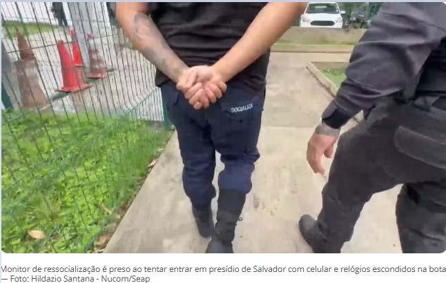 Na quarta-feira (7/05), um monitor de ressocialização foi preso em flagrante ao tentar entrar no Conjunto Penal Masculino de Salvador, com um celular, três relógios smartwatches e um cabo carregador USB escondidos na bota.