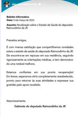 Em nota, a assessoria de imprensa do deputado divulgou em suas redes sociais, nesta quinta-feira (14/03), que ele está “seguindo rigorosamente as recomendações médicas e tem demonstrado uma notável melhora”. A equipe de Raimundinho da Jr também projetou que, em breve, quando estiver com a saúde plenamente restabelecida, ele estará apto a retomar sua rotina.