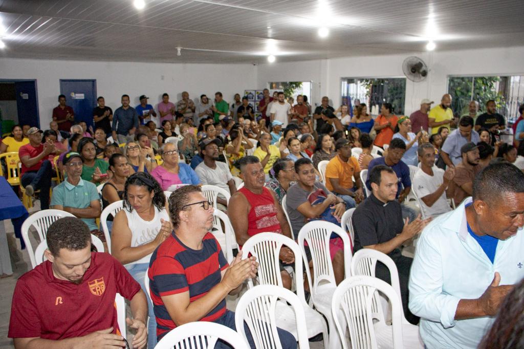 O primeiro a receber o documento, das mãos do Prefeito Jânio Natal, foi o Padre Wagnei Lima, representando a Paróquia de Nossa Senhora do Sagrado Coração; os fiéis e a comunidade aguardavam, há 10 anos, por este momento.