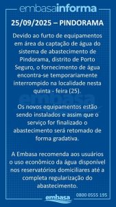 Em nota oficial enviada à nossa redação, a diretoria da Embasa, em Porto Seguro, confirmou o ocorrido e informou que já está providenciando a instalação de novos equipamentos para restabelecer o sistema. Segundo a empresa, assim que a substituição for concluída, o abastecimento será retomado de forma gradativa até a completa normalização.