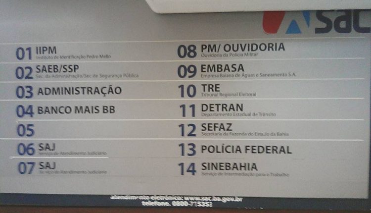 Nesse intuito, a gerente do SAC, Taline Ramos, por meio da subgerente, Josane Alves, informou sobre quais os serviços podem ser realizados através de agendamento. São eles: o da Polícia Federal – PF, realizado em seu próprio site; o do Tribunal Regional Eleitoral – TRE, no site do Sac, onde existe o limite de 60 agendamentos por dia; e o SAJ – Juizado Especial (Pequenas Causas), que pode ser feito pelo site do Tribunal de Justiça da Bahia – TJBA. Exceto o TRE, a administração não consegue saber o número de atendimentos por dia nos outros dois órgãos.
