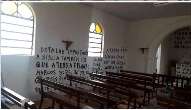 Nas paredes internas da capela, o criminoso jogou as imagens dos santos ao chão, pichou as paredes questionando as santidades e alegou que a “terra é plana”. Em outra parede, o vândalo pichou “a terra é um círculo plano com uma cúpula acima ” e “detalhe importante, a bíblia também diz que a terra é plana” seguido de citações de versículos bíblicos.